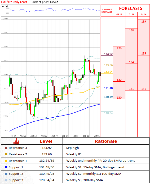 «Данные по инфляции в Еврозоне за сентябрь подтвердили то, что ЕЦБ доволен большими возможностями для смягчения монетарной политики в дальнейшем».- Capital Economics (по материалам The Wall Street Journal)Перспективы парыИз-за явного вчерашнего медвежьего настроения пары EUR/JPY, разрыв сейчас полностью закрыт. Тем не менее, сегодня валютная пара ударилась о сильную область сопротивления на 132.94/59, которая должна быть пройдена для того, чтобы цена вернулась в восходящий канал, который она формировала с первых дней августа. В то же время, краткосрочные технические индикаторы не поддерживают восхождение.