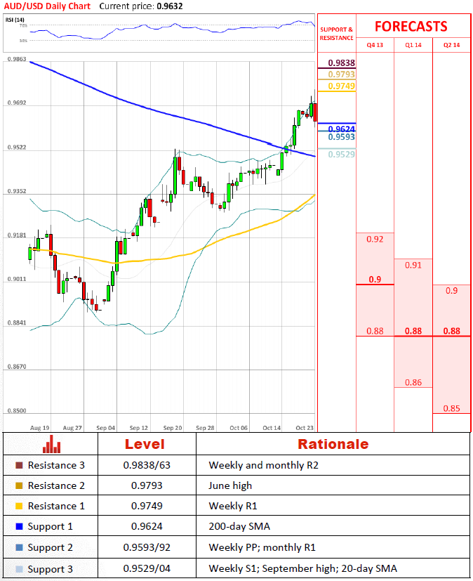 Pair did not manage to advance above weekly R1, what would have put June high on the map, and at the moment is hovering slightly above the 200-day SMA. Mainly due to quite a few individual technical indicators and the Stochastic indicator in the medium term that give bearish outlook we expect the pair do trail lower. To be fair, we don't see it dipping below the 95 cents in the nearest future, but it should not cause any major rallies.