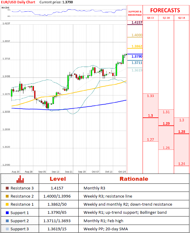 EUR/USD has stalled after a breach of the resistance at 1.3790/65, but is nonetheless capable of adding to the recent gains. The currency pair is likely to rise around 90 pips, then it will encounter the major down-trend that is expected to negate the current bullish momentum and turn the price around, sending it en route to the long-term target at 1.3 and possibly even lower.