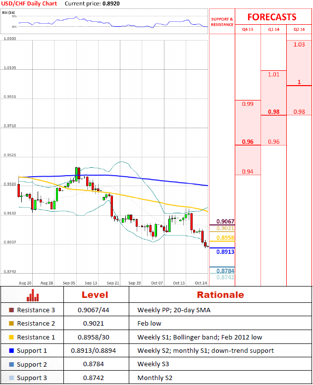 While in many other currency pairs the U.S. Dollar started to appreciate following a strong sell-off, USD/CHF remains under considerable pressure—it has already dipped below the Feb 2012 low and is currently eroding the support at 0.8913/0.8894. Should this zone, created by the monthly S1 and the down-trend line, give in, the pair will likely aim for the Oct 2011 low at 0.8568.