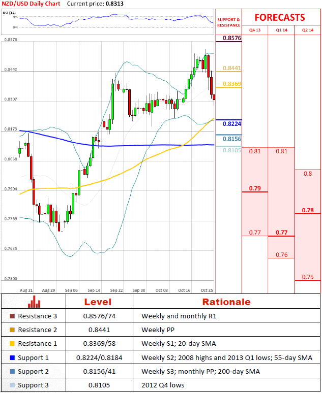 Since none of the nearest supports were capable of withstanding the bearish pressure after 0.85 proved to be impenetrable, NZD/USD has entered the area that is largely free from any major levels. Accordingly, the pair is now well-positioned to aim for the lows seen in the first quarter around 0.82, although the daily and weekly technicals are pointing upwards.