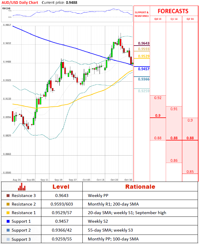 Перспективы пары Пара продолжает падать и на данный момент она поддерживается недельной S2. Мы не ожидаем, что это продлится долго. Мы можем видеть некоторое бычье настроение, так как краткосрочный Стохастический индикатор указывает на удорожание пары. Мы бы посоветовали фокусироваться на 55-дневной средней скользящей, которая сейчас находится на 0.9366. Она может дать начало сильному восхождению или падению под себя, что может привести к снижению пары до 0.9259.