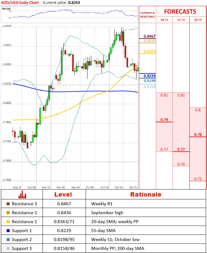 Перспективы пары Пара упала ниже минимума октября, но отскочила от него и на данный момент она торгуется немного выше 55-дневной средней скользящей. Она должна продолжить поддерживать пару на какое-то время и только стабильное закрытие под 200-дневной средней скользящей может нейтрализовать это бычье настроение и послать пару вниз до 0.800. Для того, чтобы увидеть восстановление пары, она должна закрыться выше 20-дневной средней скользящей.