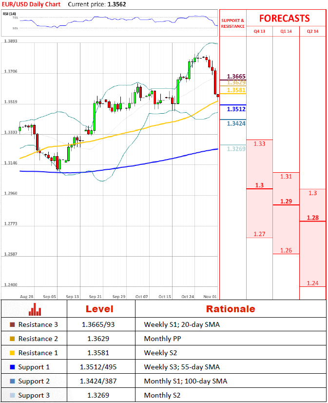 Перспективы пары Кросс евро-доллар провалился сквозь несколько сильных технических уровней, одним из них была поддержка восходящего тренда, потеряв в итоге 140 пунктов и теперь близится к недельной поддержке S3/55-дневному скользящему среднему. Медведи могут капитализировать свою прибыль около отметки 1.35, что может предоставить некоторые бычьи сигналы на среднесрочный-долгосрочный период, но мы верим, что медвежья тенденция будет продолжаться в ближайшем будущем.