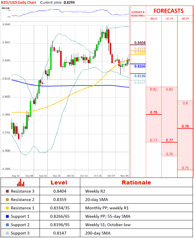 Перспективы пары Пара отскочила от недельной точки разворота и продолжает показывать мягкое бычье настроение, но она, кажется, будет торговаться в узком диапазоне в любом случае (от 0.8196 до 0.8334 в средне и долгосрочной перспективе; от 0.8266 до 0.8334 в краткосрочной перспективе). Если пара сможет вырасти выше 20-дневной средней скользящей, это поставит на карту максимум октября около 0.8540. Падение ниже 0.8196 может спровоцировать значительное падение и мы можем увидеть распродажи пары вплоть до 79 центов. Это там, где находится среднее ожидание главных участников рынка на этот квартал.
