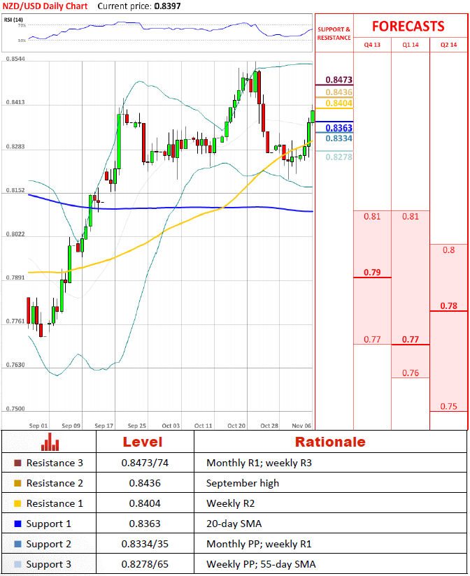 Перспективы пары После торговли в узком диапазоне на протяжении больше двух недель пара сменила тренд, выросла выше 20-дневной средней скользящей и на данный момент нацеливается на недельную R2 на 0.8404. Падение ниже 0.8334 нейтрализует наибольшую часть бычьего настроения. Рост выше максимума сентября на 0.8436 поставит на карту максимум октября на 0.8541.
