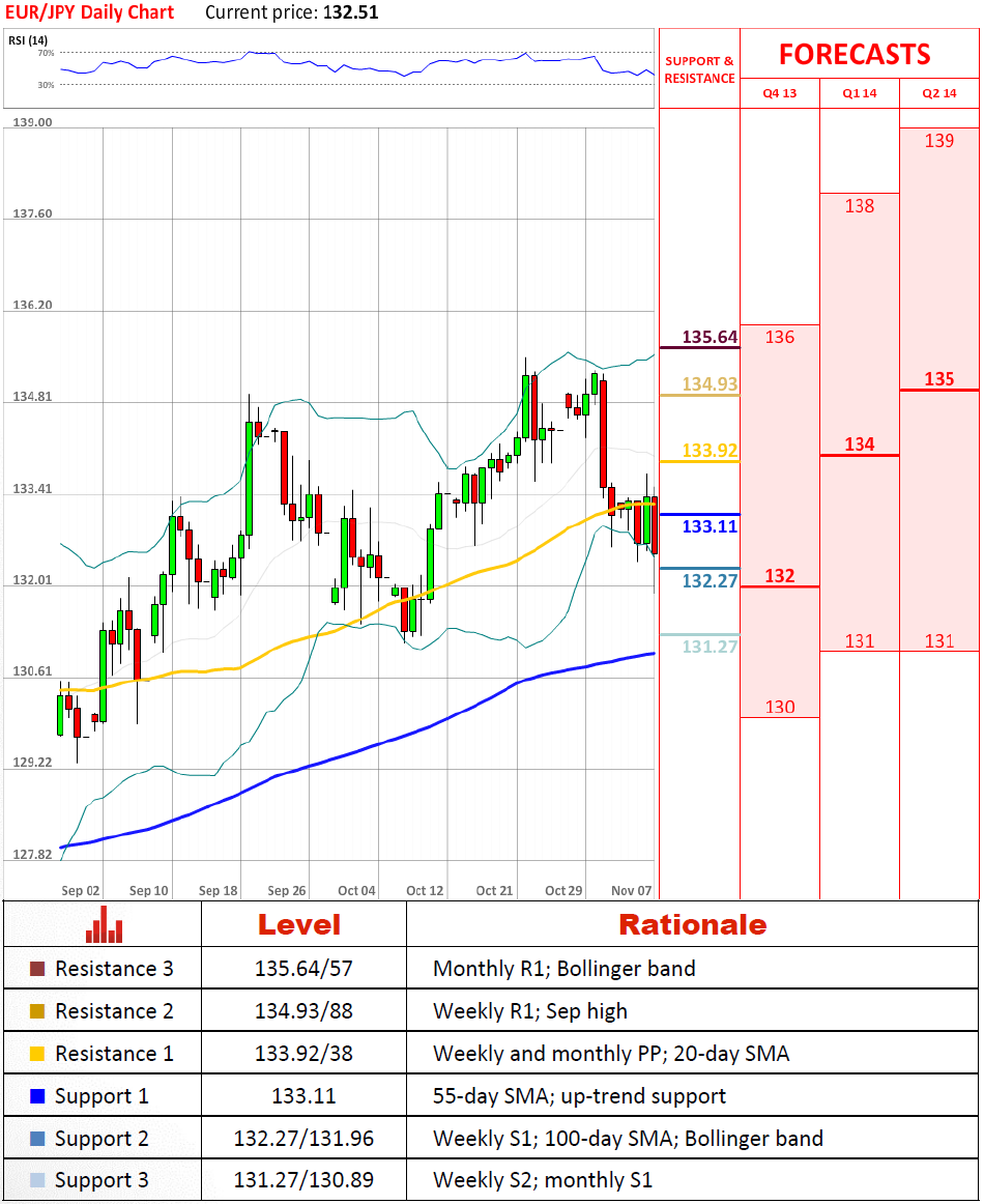 - HSBC Holdings Plc (по материалам Bloomberg)Перспективы парыРастущая тренд-линия поддержки, около который на этой недели торгуется валютная пара, предрасположена на этой неделе к восхождению, так как она сохраняет восходящий импульс неутронутым с середины июня. Тем не менее, на данный момент евро торгуется под 133.11 и уже тестирует некоторые более низкие уровни, такие как 132.27/131.96 (100-дневная средняя скользящая), и это означает, что имеет высокий шанс, что текущий тренд будет изменен с бычьего на медвежий.