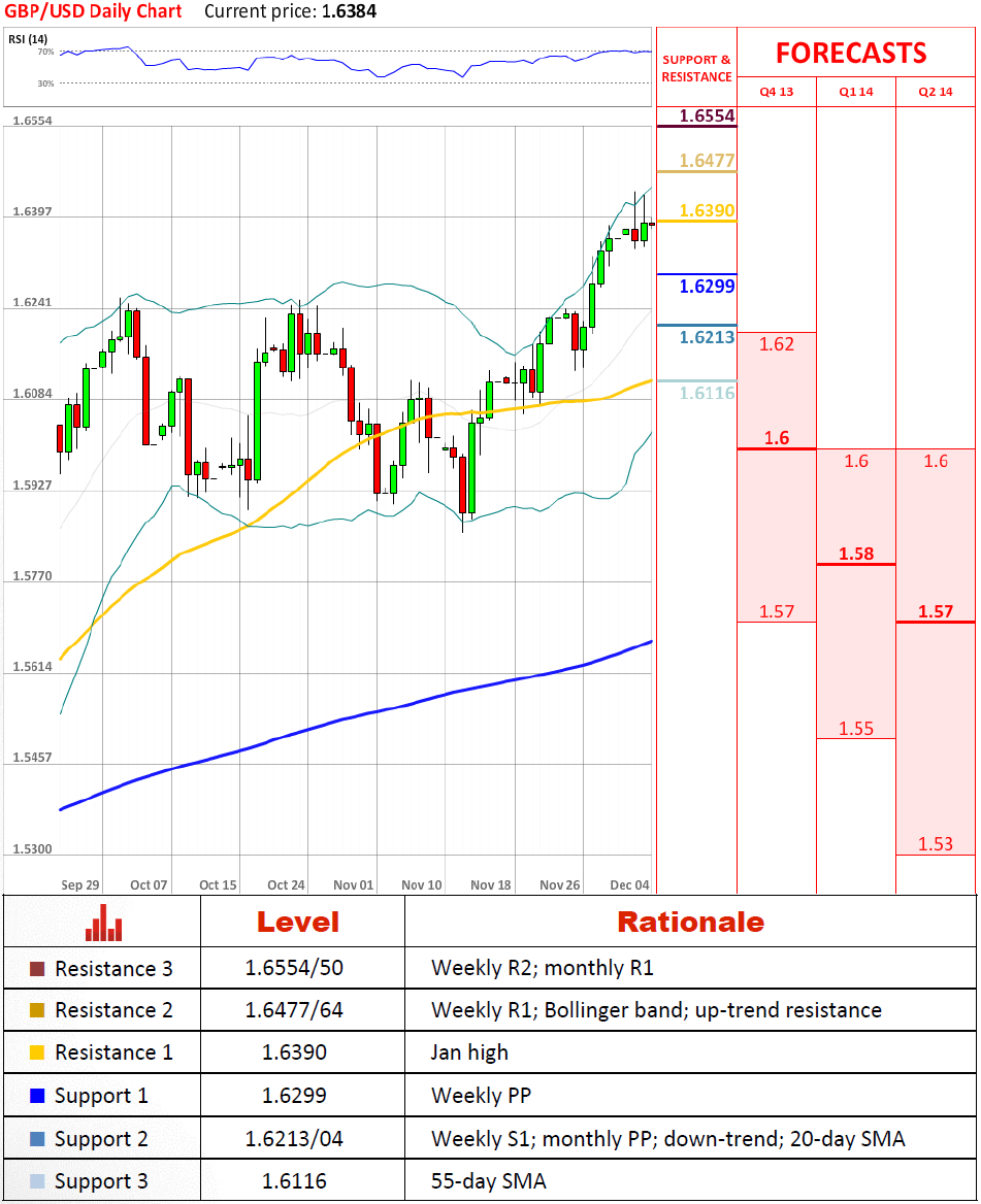 Being supported by the rising trend-line the Cable has launched yet another attack on the Jan high at 1.6390, even though the technical studies stayed largely mixed. As soon as this level is broken, there will be only two significant resistances left to overcome in order to reach 1.6745/15, namely 1.6477/64, which is created by the rising resistance line and weekly R1, and 1.6554/50 (monthly R1).