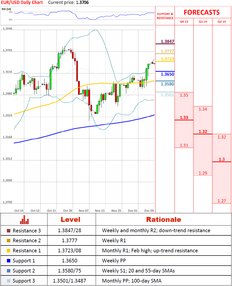 As was implied by the near-term technical indicators, the Euro continued to move further north. However, it seems the currency pair has lost bullish momentum during the weekend in view of a formidable resistance area at 1.3723/08, consisting of the up-trend, Feb high and the monthly R1 level. Considering there are no strong supports nearby, there is a risk of a pull-back down to the 55-day SMA at 1.3580/75.