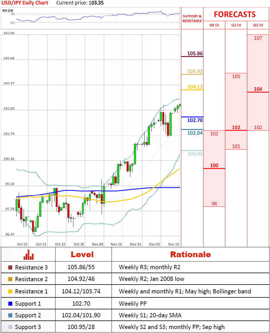 Перспективы парыUSD/JPY продолжает торговаться внизу под линией поддержки предыдущего ускоренного восходящего тренда, но тем не менее, она сохраняет сильный импульс к повышению. Всё же, проверка сопротивления на 104.12/103.74 потенциально может закончиться явной медвежьей коррекцией, учитывая отсутствие значительных линий поддержки в близи, что могли бы удержать валютную пару в случае устойчивой распродажи.