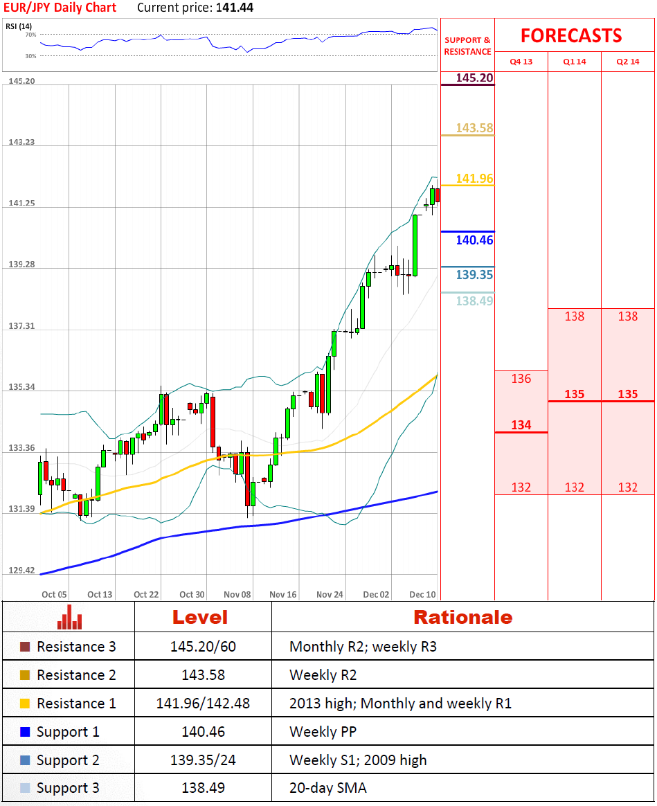 Перспективы пары Пара, кажется, формирует максимум 2013 года, так как она сделала шаг назад от своего восхождения на недельной и месячной R1. Тем не менее, даже если это будет максимум 2013 года, мы не ожидаем, что за этим последуют распродажи. Пара должна остаться выше месячной точки разворота. В случае неожиданного падения там, пара должна будет упасть до недельной S1/максимума 2009 года. Закрытие выше 141.96/142.48 поставит на карту недельную R2.