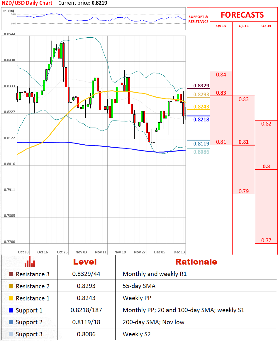 «Процентные ставки хороши тем, что влияют в ценах на очень большое количество действий на следующий год. Это будет сохранять её достаточно сильной, и она может пойти даже выше, когда все на самом деле случится».- Commonwealth Bank of Australia (по материалам TVNZ)Перспективы парыПоследние три дня говорят о том, что пара, скорее всего, торгуется в узком диапазоне. Это стало еще более ясным сегодня, когда пара протестировала 0.8218/187 еще раз, но не смогла консолидировать выше этого уровня. Мы не ожидаем каких-либо значительных распродаж или восхождений, которые могут развиться из этой ситуации, но если пара останется выше 82 центов, мы ожидаем, что она начнет новую неделю выше уровня закрытия этой недели. Падение ниже 82 центов откроет путь распродажам до 200-дневной средней скользящей.