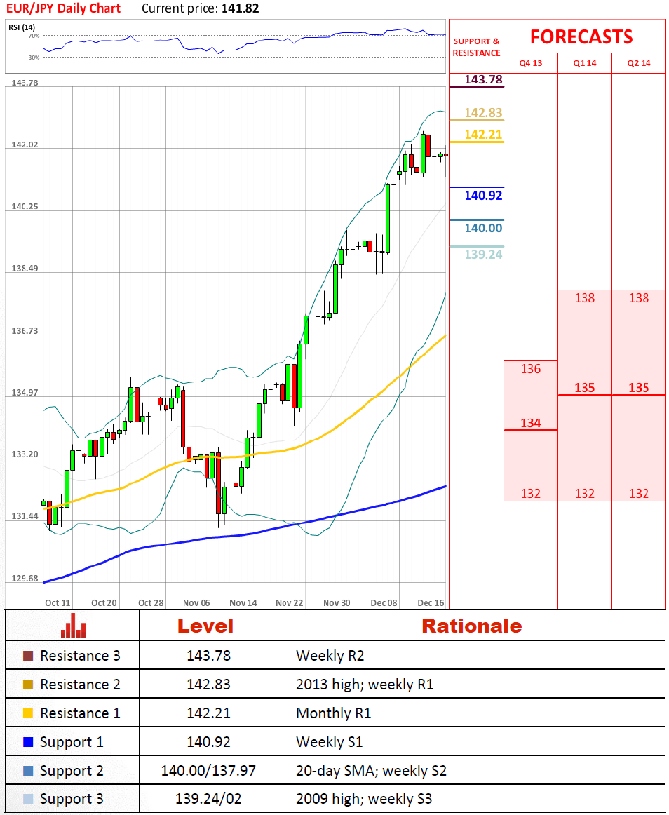 Перспективы пары Пара начала неделю пассивно и на данный момент она колеблется ниже месячной R1. Так как мы видим некоторое медвежье настроение сегодня, мы ожидаем, что оно сохранится в кратко и среднесрочной перспективе. Тем не менее, если недельная S1 выдержит первоначальный тест, мы можем ожидать, что пара будет торговаться в узком диапазоек в течение какого-то времени. Стабильное закрытие ниже неё может вызвать распродажи под максимума 2009 года немного выше 139 иен. Краткосрочные максимумы остаются возможными, но мы не ожидаем, что пара вырастет выше недавно сформированного максимума 2013 года.