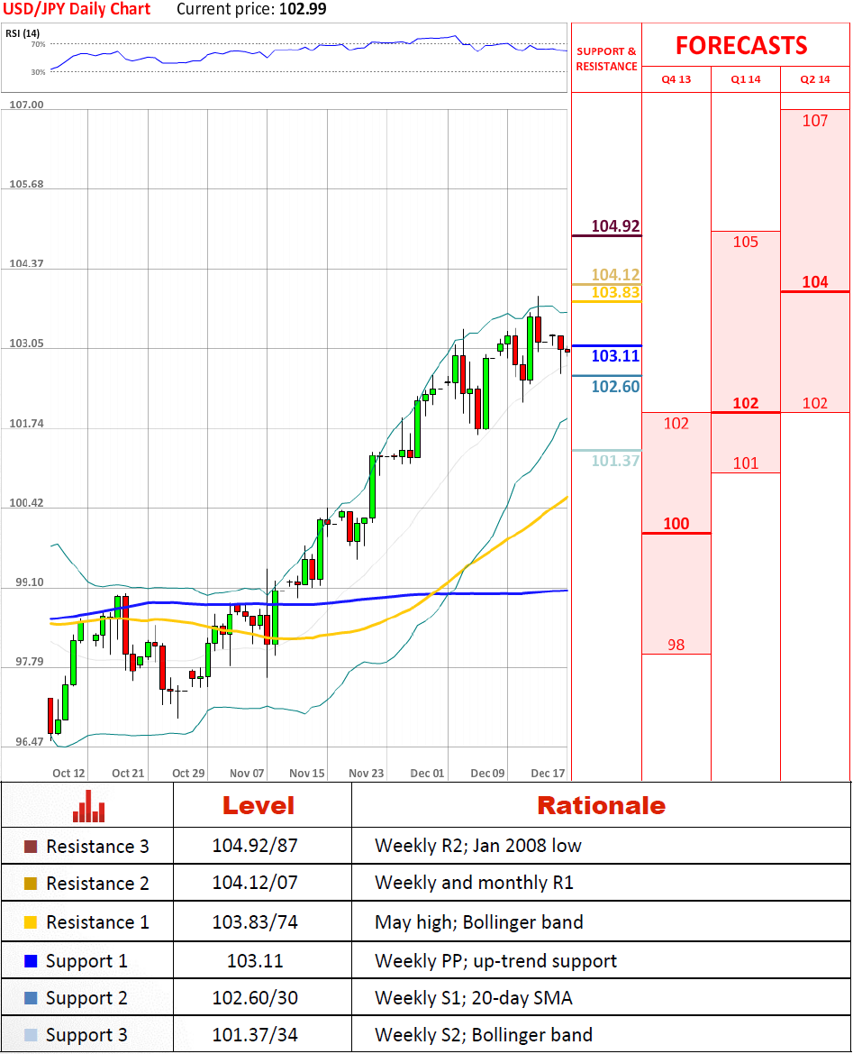 Перспективы парыВвиду того, что пара USD/JPY не закрылась под восходящей линией поддержки, нам не стоит исключать возможность подъёма, что прорвётся через сопротивление на 103.83/74. Затем, валютной паре останется только превысить уровень 104.12/07 ради того, чтобы достигнуть 104.87. Тем не менее, если линия тренда будет нарушена, это потенциально может привести к понижению до 100.86.