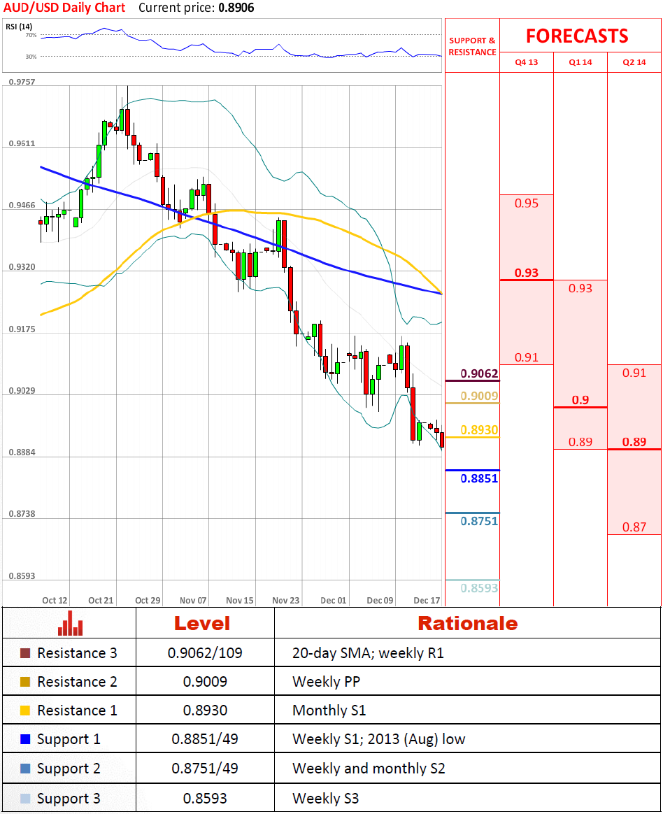 «Тогда как Резервный банк Австралии, с одной стороны, пытается толкнуть валюту ниже, это почти похоже на нехватку правильного направления – они машут рукой с одной стороны и, с другой стороны, они замечают несколько вещей, которые смотрятся немного лучше».- RBS (по материалам The Sydney Morning Herald)Перспективы парыПара продолжает падать ниже и показывает более четкое медвежье настроение. Мы ожидаем, что она продолжит дешеветь, но кажется очень сомнительным, что она может упасть ниже минимумы августа 2013 года. В случае, если это случится, это может с легкостью открыть путь до 0.859. Как мы можем видеть, пара имеет на своем пути значительный нисходящий риск, который может быть увеличен, если пара покажет стабильное закрытие выше 20-дневной средней скользящей.