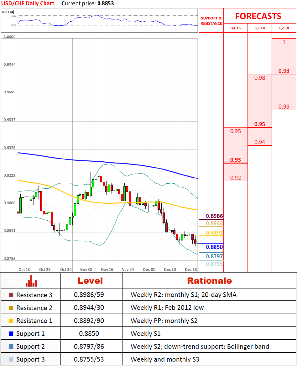 Перспективы пары USD/CHF на данный момент преодолевает недельное S1 и вряд ли остановится на этом. С другой стороны, зона поддержки на 0.8797/86 имеет потенциал предотвратить дальнейшее понижение - она состоит из недельного S2 и нисходящей линии поддержки. Тем не менее, мы не можем пренебрегать вероятностью, что нынешний медвежий импульс закончится только на 0.8755/53 или на 0.8630.