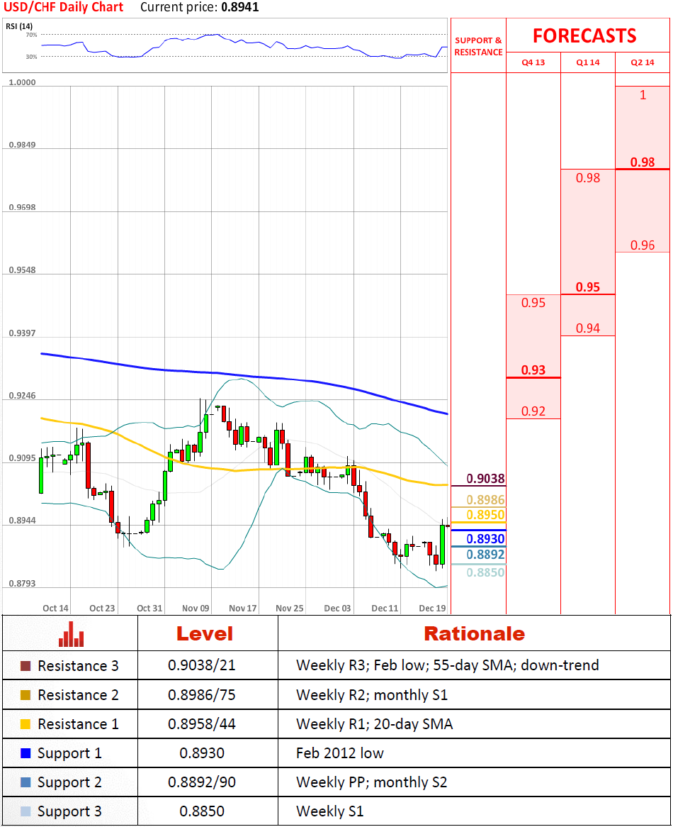 Перспективы парыПредположение, что USD/CHF понизится до 0.8798/97 перед оживлённым восстановлением, оказалось необоснованным — курс уже прошёл несколько уровней сопротивления и в текущее время проверяет 0.8958/44. Если бычий импульс будет сохранён, месячная поддержка S1 также может стать жертвой ралли, поскольку через сопротивление на 0.9038/21 пробиться будет труднее.