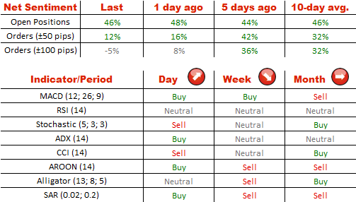 Nearly three out of four (73%) traders presently reckon that USD/CHF will stay on a bullish path for the foreseeable future. At the same time the difference between the amounts of buy and sell orders is insubstantial—the former constitute 47.5% and the latter—52.5% of the market.