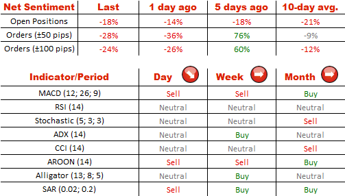 There has been a slight increase in the number of short positions open on EUR/USD since the last report. Right now they constitute 59% of the market (57% yesterday). At the same time the sell orders placed 100 pips from the current price are in a majority—62% of the total amount.