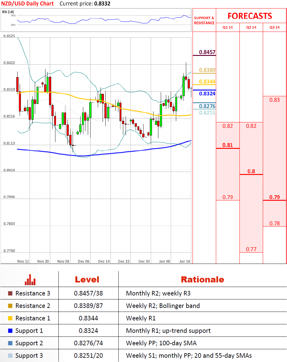A failure to gain solid ground above the weekly R2 may now lead to a test of the support at 0.8275/74, created by the weekly PP and the 100-day SMA. However, there is also strong demand in the region of the monthly R1, which is reinforced by the up-trend that has been in force since the beginning of this year. Still, despite the positive daily outlook suggested by the indicators, in the medium term NZD/USD is likely to breach these levels and aim for 0.81.