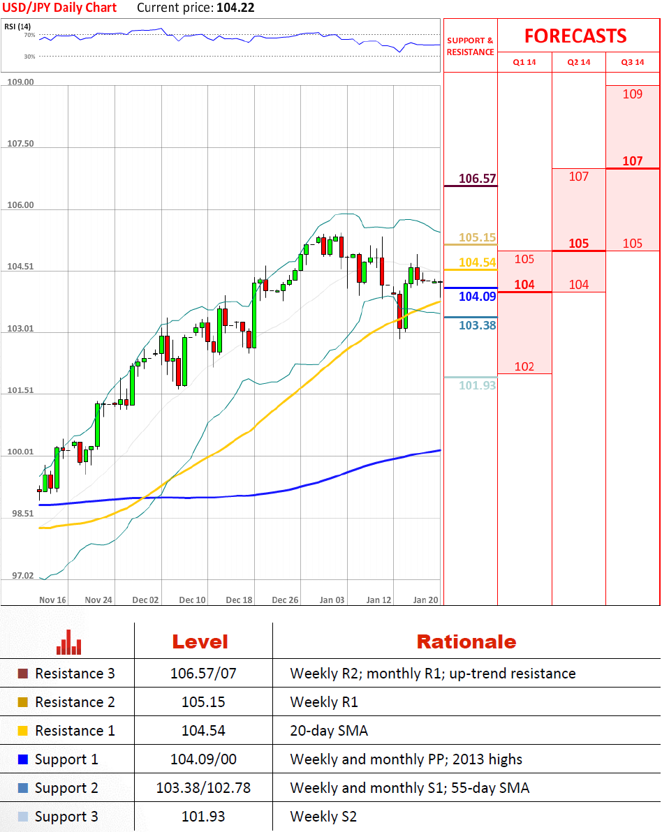 Although the longer-term technical indicators are mostly giving ‘buy' signals, USD/JPY continues to gravitate towards 104.09/00, consisting of the monthly PP and the 2013 highs. In order for the bias to remain bullish, this support should withstand the current bearish pressure and then initiate a recovery, which will encounter the weekly R1 at 105.15 and the monthly R1 at 106.57.