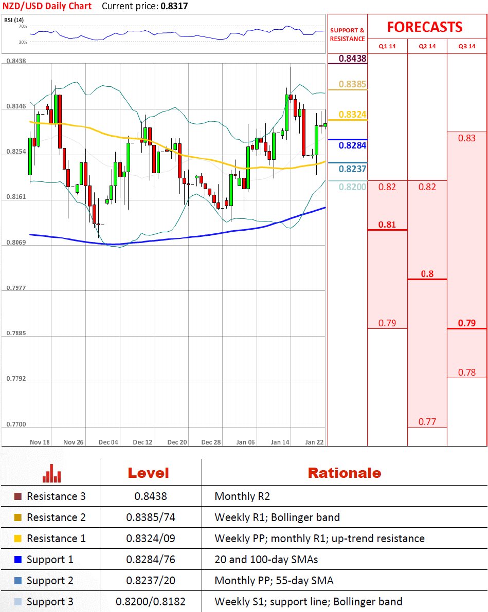 Although NZD/USD did confirm the resistance at 0.8324/09 yesterday as a notable level, the rate keeps on rising, thereby once again endangering intactness of the up-trend line that may be drawn through the troughs staged from Dec 30 to Jan 16. Continuation of the up-move may potentially expose the monthly R2 at 0.8438, however, the long-term outlook is still negative.