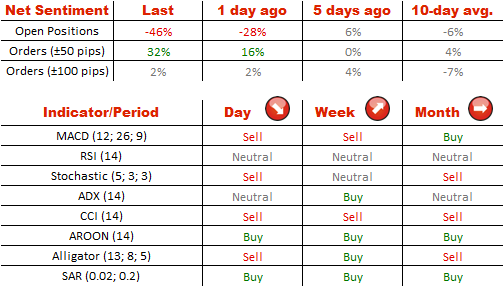 В то время как трейдеры по паре EUR/USD были вынуждены изменить свои позиции, стерлинг начал продаваться с большим энтузиазмом - доля коротких позиций сократилась с 64% до 73%. Говоря об ордерах, поставленных на фунт в пределах 100 пунктов от спота, количество тех, что выставлены на покупку и продажу, равно.