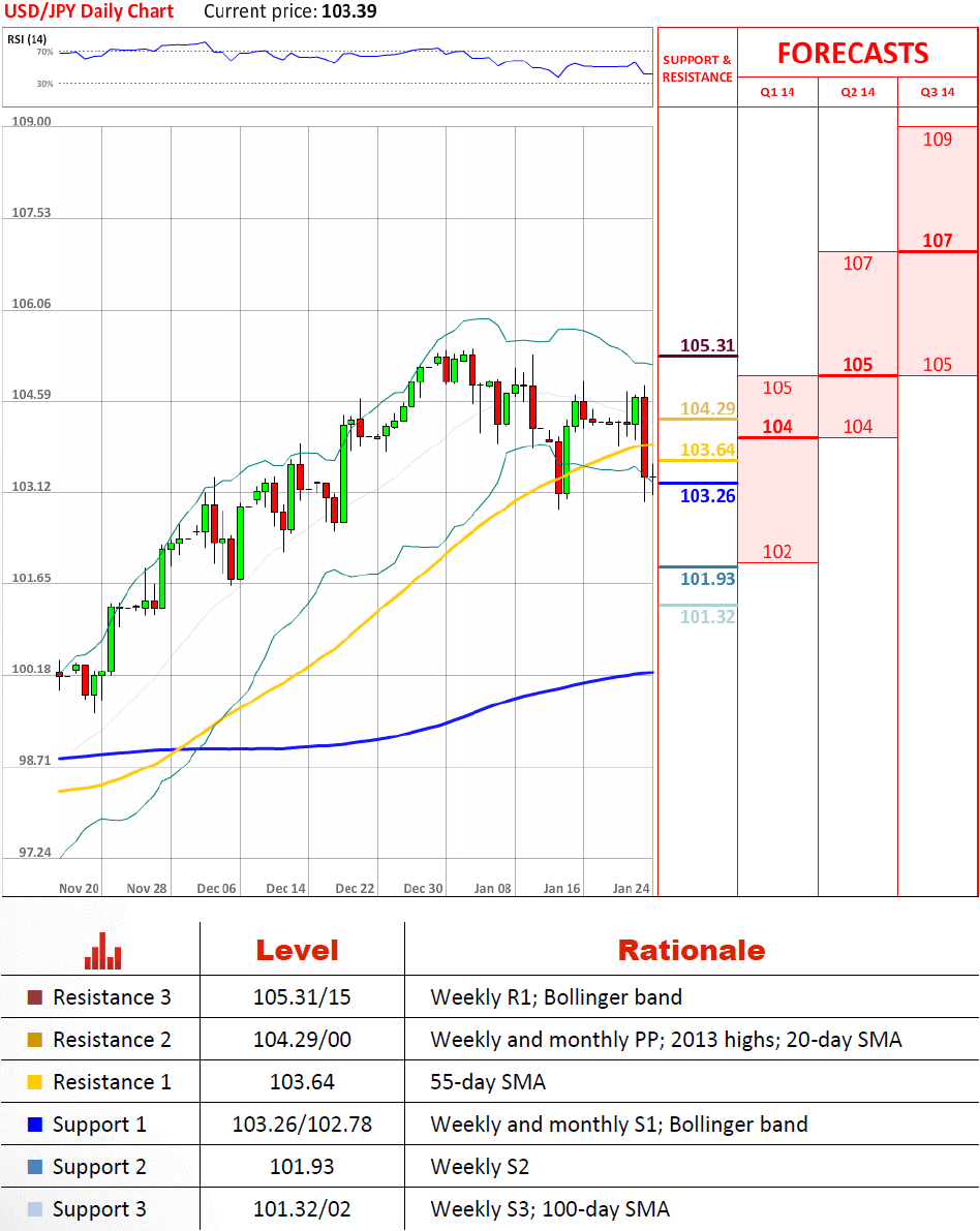 Надёжная на вид поддержка, состоящая из месячной точки разворота и максимумов 2013 года, не смогла удержать USD/JPY на плаву и позволила курсу упасть сквозь 104.29/00. Как следствие, 55-дневное простое скользящее среднее было также нарушено, но у нас до сих пор имеются недельные и месячные уровни S1 на 103.26/102.78, которые могут быть способными сдержать понижение и восстановить бычье настроение.