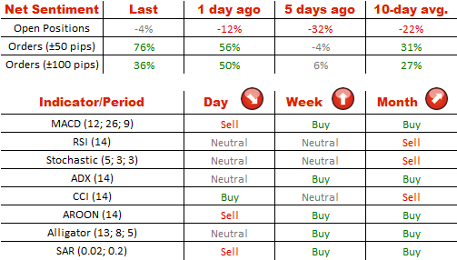 После вчерашнего падения USD/JPY, сейчас на рынке значительно меньше участников, которые верят, что доллар США упадёт ещё ниже - 52%, и это означает, что настроение нейтральное. В то же время, подавляющее большинство (68%) отложенных ордеров выставлены на приобретение доллара против йены.