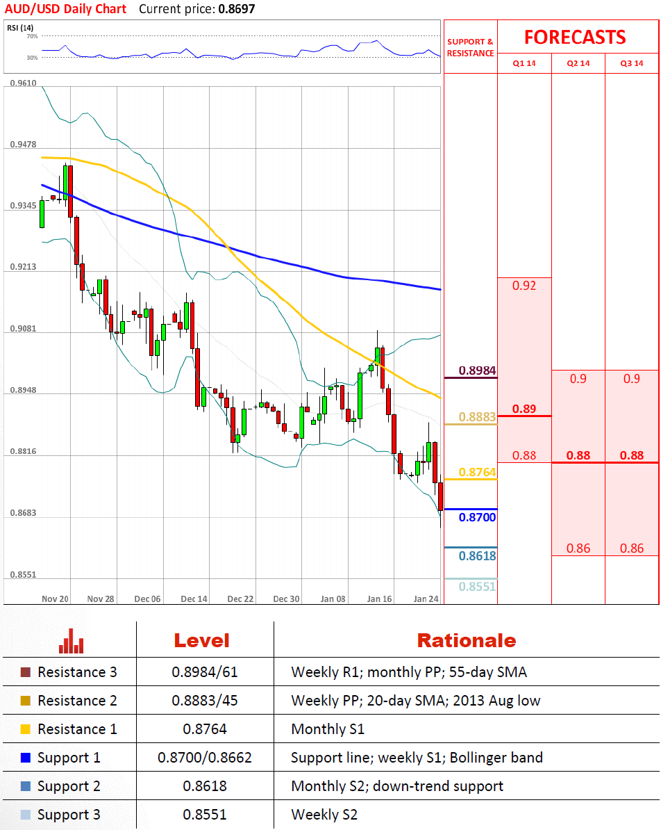 Перспективы пары Пара AUD/USD уже пересекла месячную S1 на 0.8764, и сейчас она пытается нарушить следующую область поддержки на 0.8700/0.8662. Если медвежья тенденция сохранится, тогда валютная пара может вскоре приблизиться к нисходящей линии тренда, которая действовала в виде сильной линии сопротивления два последних месяца 2013 года. Соответственно, имеется потенциал предоставить австралийскому доллару бычий импульс, которого валюте не хватает с середины января.