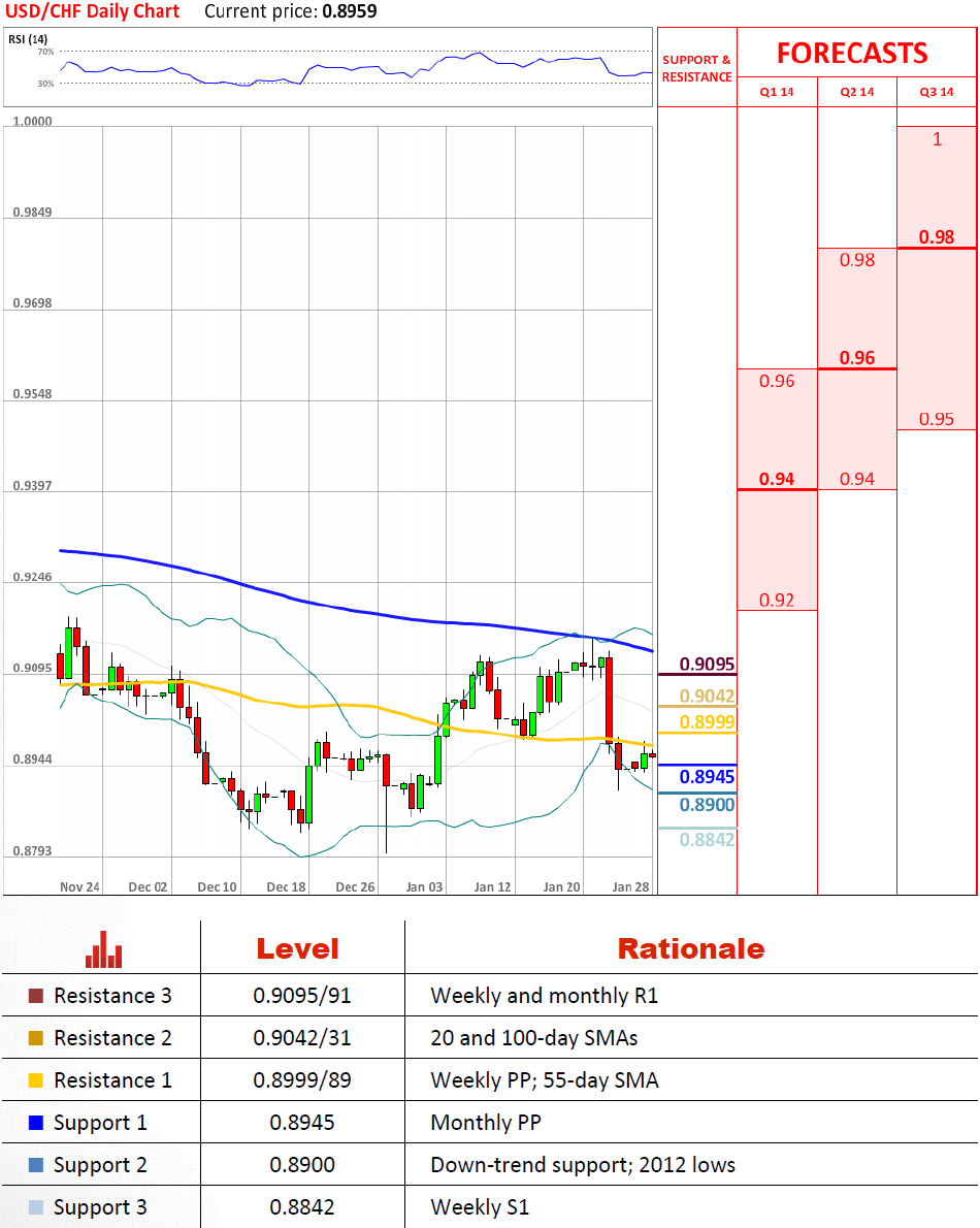 Перспективы пары Американский доллар возвращает свои прежние позиции, и USD/CHF не является исключением. На данный момент валютная пара пытается преодолеть 0.8999/89 и таким образом открыть путь к 0.9042/31, где, в лице 20 и 100-дневных простых скользящих средних, предполагается поддержка. Следующей целью будет месячное R1 на 0.9091, так как бычий импульс не должен быть нарушен до тех пор, пока мы не достигнем 200-дневное простое скользящее среднее.