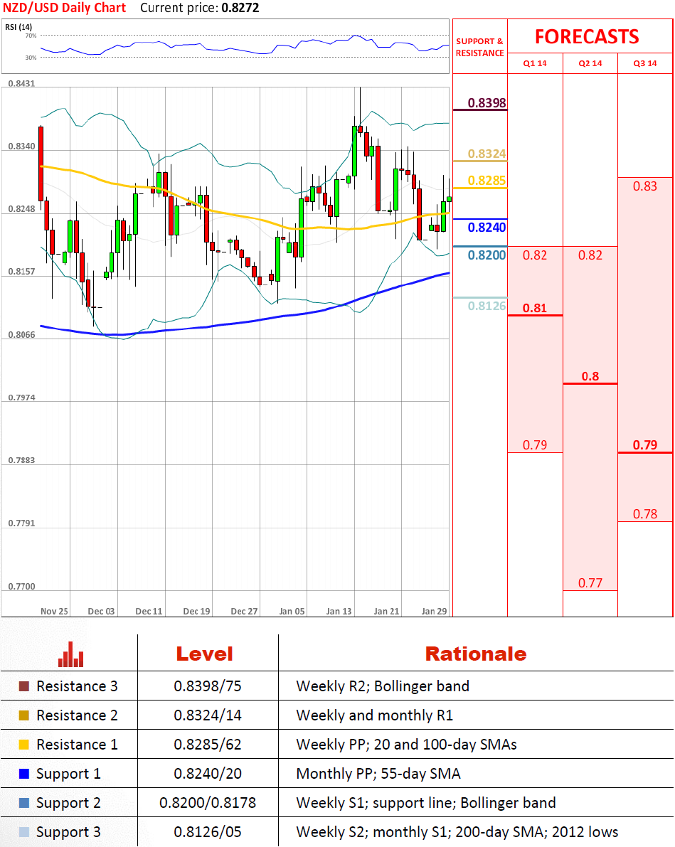 «Наши экономисты спорят, что так как данные по занятости были негативными, импульс в общем объеме выпуска остается достаточно солидным. Шум на развивающихся рынках дает дополнительную неуверенность, но кажется маловероятным, чтобы привить достаточный страх, заставив ФРС нервничать».- RBC (по материалам MarketWatch)Перспективы парыПоддержка на 0.8240/20, сформированная месячной точкой разворота и 55-дневной средней скользящей, кажется остановила нисходящий импульс, который сохранялся с 14 января. Тем не менее, новозеландский доллар до сих пор должен закрыться выше 0.8285/62, тогда мы может предполагать, что краткосрочный нисходящий риск нейтрализован. Несмотря на это, долгосрочный уклон остается негативным.
