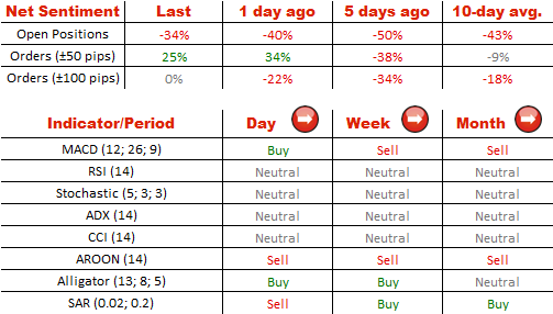Настроение трейдеровПодавляющее большинство участников рынка остаются уверенными, что новозеландский доллар не сможет восстановиться – на данный момент 67% позиций являются короткими по нему. Что касается ордеров, размещенных по NZD/USD, то равное количество в диапазоне 100 пунктов от цены размещены на покупку и продажу пары.