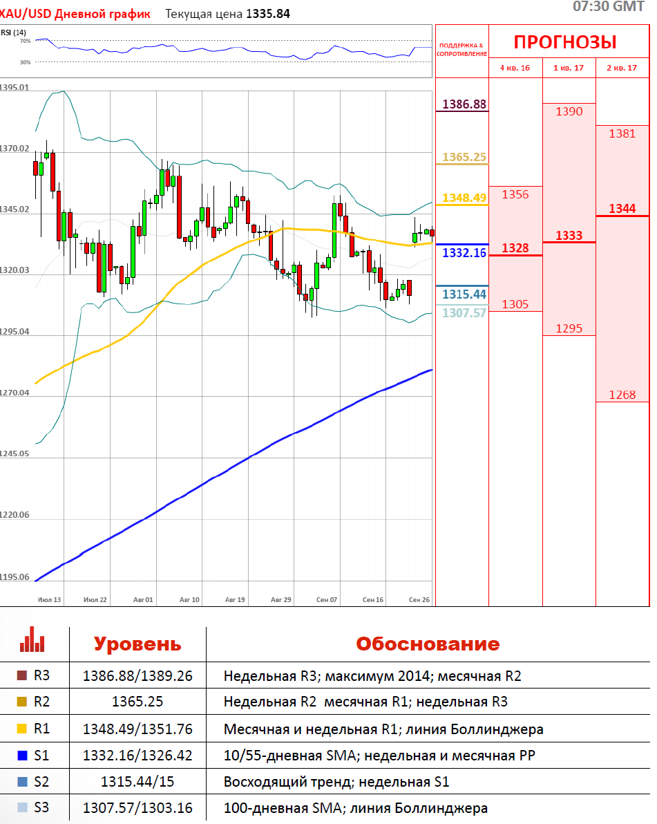 Цена на золото продемонстрировала небольшое снижение ввиду фиксации прибыли после скачка цены до максимума 2-х недель. Как известно, золото заметно увеличилось после решения ФРС повременить с поднятием процентной ставки. В конце прошлой недели, золото консолидировалась вблизи своих максимумов на отметке 1340. Если цена предпримет ещё одну попытку к росту и пронзит отметку 1340, мы сможем наблюдать преодоление уровня 1350. В таком случае, золото закрепиться на отметке 1351,16 или недельной R1.