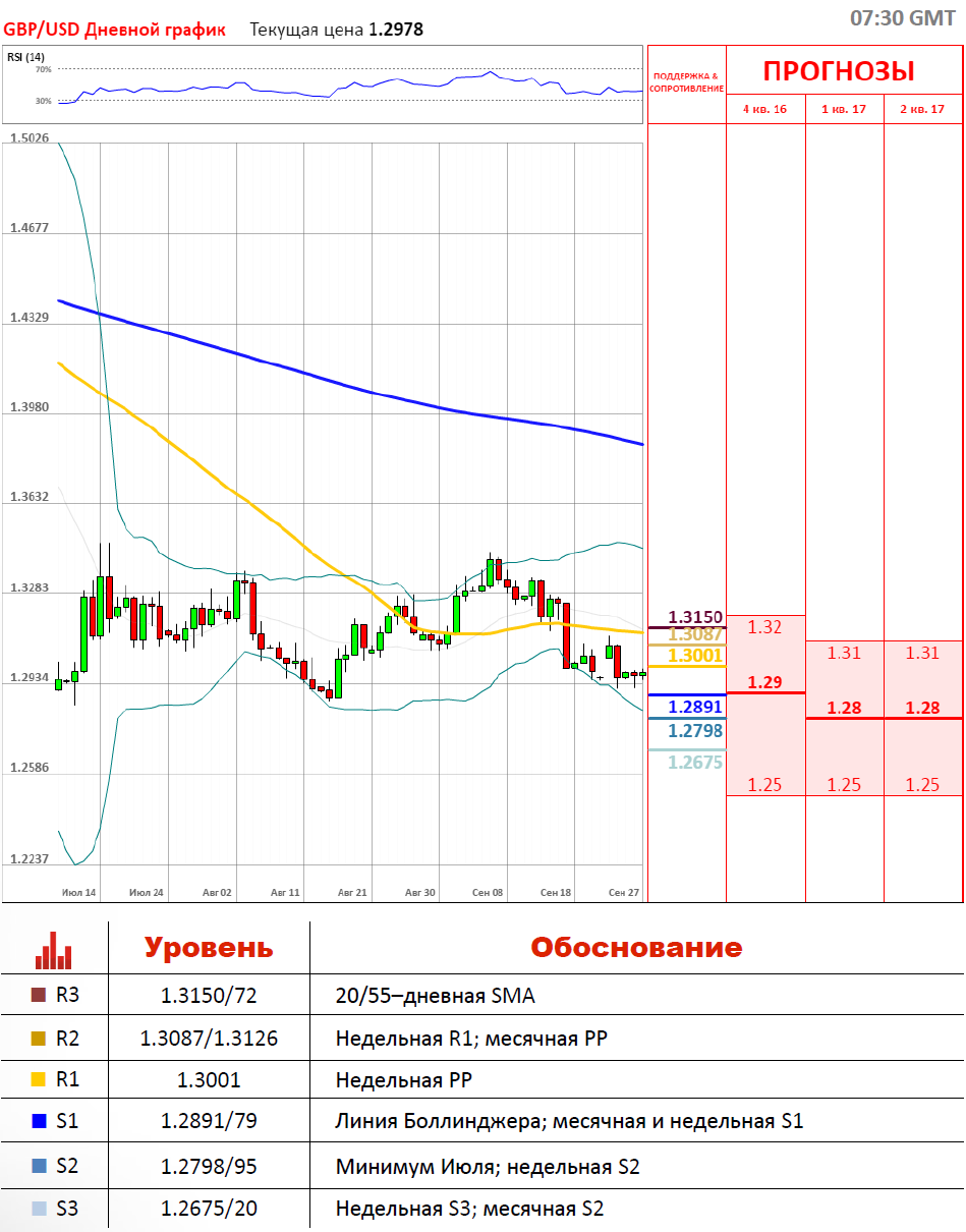 Доллар немного ослабил свои позиции, отступив назад, так как инвесторы заняты анализом решения ФРС отстрочить изменение процентной ставки. Более того, вчера, фокус рынка был направлен на дебаты кандидатов в президенты США. Также, по паре, вчера, сохранялось нисходящее движение, цена торговалось под недельной PP на уровне 1.3001 будучи подкрепленной месячной S1 на отметке 1.2880. Во вторник, пара наоборот смогла немного подрасти, пробив недельную PP и закрепившись на 1.3010. На данный момент ближайшей целью пары выступает уровень 1.31.