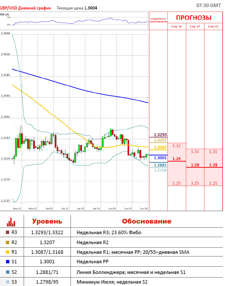 В течении вчерашнего дня, фунт находился под давлением, ввиду снижения цены на нефть, которые реагируют на комментарии стран ОПЕК на встрече в Алжире. Согласно информации, министр нефти Ирана предполагает обмен мнениями на данной встрече. Как известно пара опустилась ниже недельной PP на отметке 1.3001 и остановилась на отметке 1.2936. Тем не менее, сегодня, торги были открыты на более позитивной ноте, снова торгуясь над недельной PP. Воздержание от торговли может быть рекомендовано на ближайшие часы, в то время как инструмент, скорее всего продолжит свое развитие в боковом диапазоне.