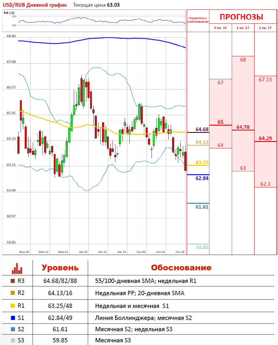 «На сегодня, 29 сентября, можно рассмотреть снижение курса доллара до 62,85 рубля. Поскольку после ралли по нефти возможна нисходящая коррекция в область $47,80, то от 62,85 рубля можно ждать восстановление цен до 63,17 рубля».