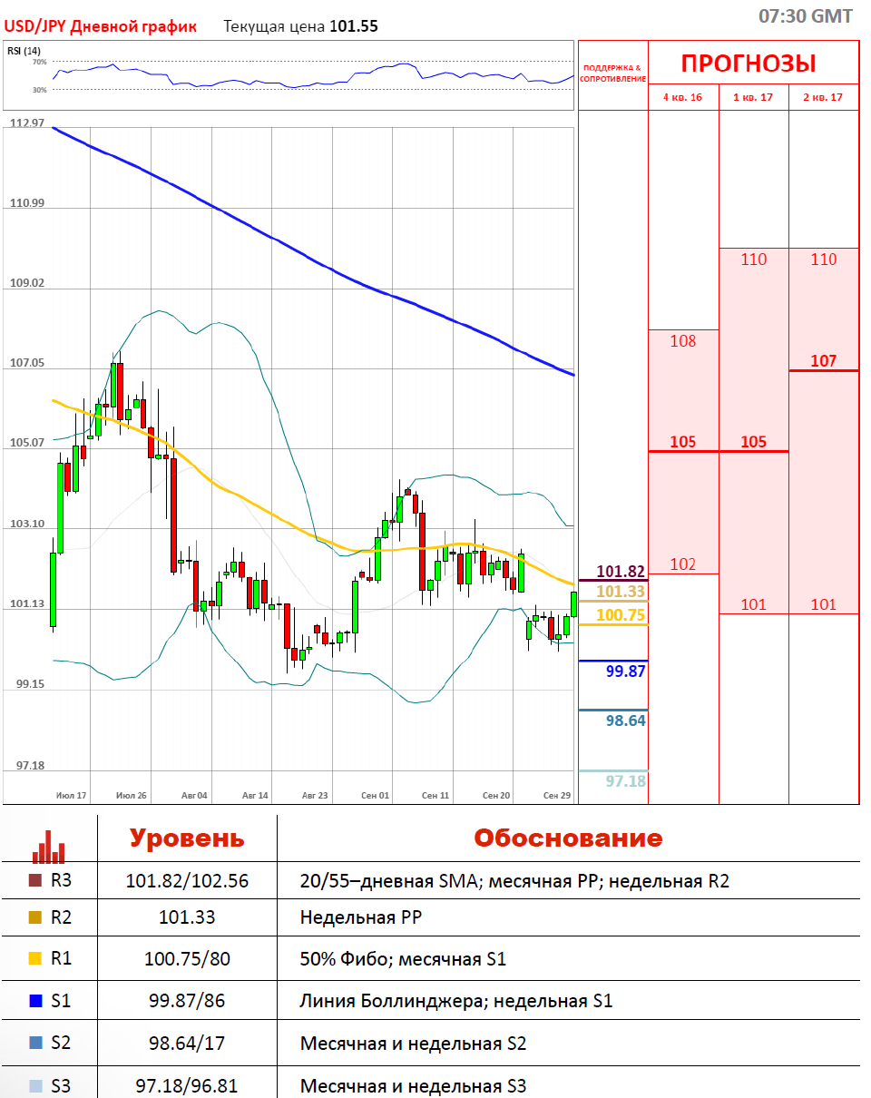 В среду, доллар вырос по отношению к йене, так как участники рынка стали фиксировать прибыль. Также, дополнительную поддержку доллар получил ввиду позитивного настроения после дебатов между кандидатами на пост президента США. Тем не менее, торговля была завершена на спокойной ноте. Сегодня доллар окреп ещё существеннее, с легкостью преодолев месячную S1 на отметке 100.80, а также недельную PP на уровне 101.33. Если восходящая коррекция продолжиться, пара выйдет из нисходящего канала и попытается пронзить месячную S2 на уровне 102.16.