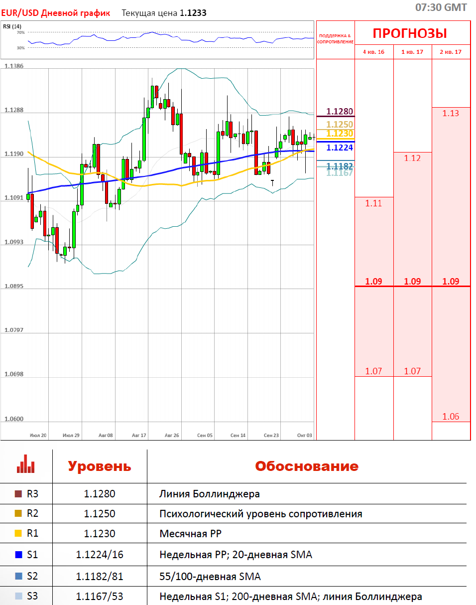 К концу прошлой недели, европейская валюта сумела укрепить свои позиции после слабых данных по американской экономике, которые и привели к быстрому росту пары уже во второй половине дня на торгах в пятницу, 30 сентября. Завершились торги в пользу евро, который укрепился против доллара США на 18 пунктов, волатильность торгов составила 97 пунктов. Тем не менее, сейчас валютная пара торгуется в красной зоне, где уже сумела пересечь недельную РР на отметке 1.1223. Следующей целью для пары выступает 20-дневная SMA, которая расположилась на 1.1215.