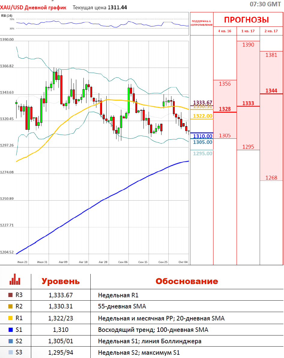 Цены на золото незначительно изменились, оставаясь у двухнедельного минимума вчера, в понедельник, поскольку настроения участников рынка улучшились, так как обеспокоенность проблемами Deutsche Bank ослабла. Кроме того, цены на золото упали на фоне укрепления доллара после после данных об индексе потребительской уверенности, которяая составляет 91,2 в сентябре, выше предварительных 89,8 и прогнозируемых 90,0. Сейчас металл продолжает торговаться в красной зоне около 100-дневной SMA, расположившейся на 1,310.