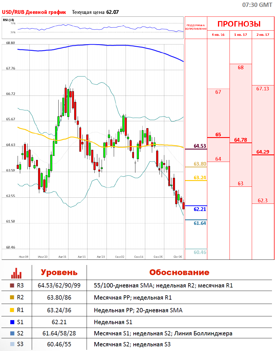 Вчерашние торги, 6 октября, закрылись снижением по американскому доллару к российской валюте. По итогам дня курс доллар/рубль снизился на 0,46%, до 62,05 рубля. Более того, укрепление американского доллара на рынке форекс не отразилось на курсе национальной валюты, так как она находилась под защитой нефти. Сегодня, 7 октября, участники рынков сфокусируют своё внимание на данных по рынку труда в США. Показатели с рынка труда очень важны трейдерам, так как они должны помочь понять, повысит ставки ФРС США в этом году или нет, что окажет сильное влияние на динамику валютной пары.