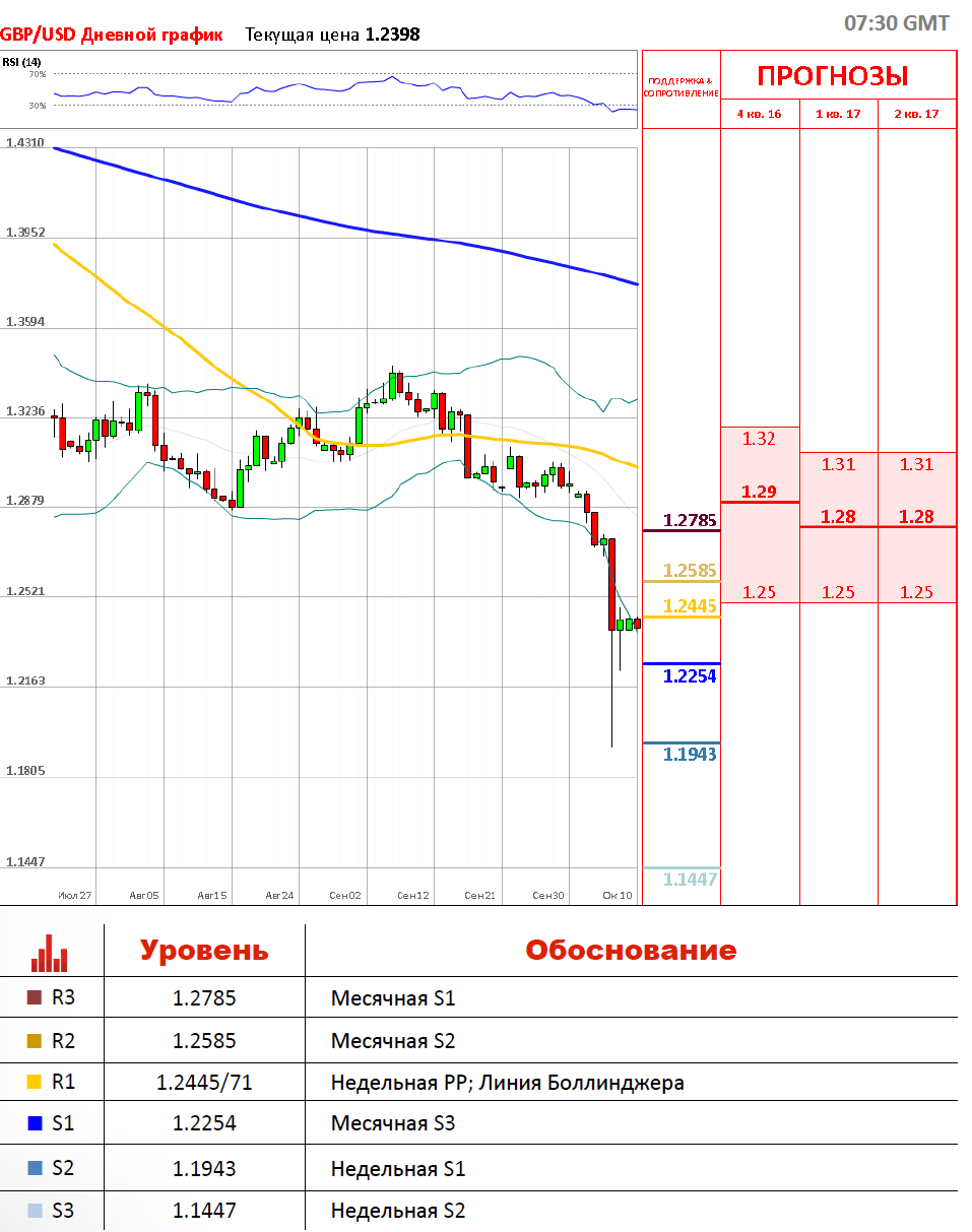 В прошлую пятницу пара обвалилась до рекордных минимумов ввиду низких показателей по Великобритании, а также заявления премьер-министра Франции о том, что он солидарен с Француа Олландом, относительно ужесточения выхода из ЕС. Пробив две линии поддержки, фунт обвалился до отметки 1.194, однако смог скорректироваться и закрыл торги на отметке 1.243. Сегодня инструмент начал торги на недельной PP, которая представлена уровнем 1.2445, однако сразу продемонстрировал нисходящую коррекция. Очевидно, что пара перепродана, поэтому можно ожидать бокового восстановления вплоть до уровня 1.25.