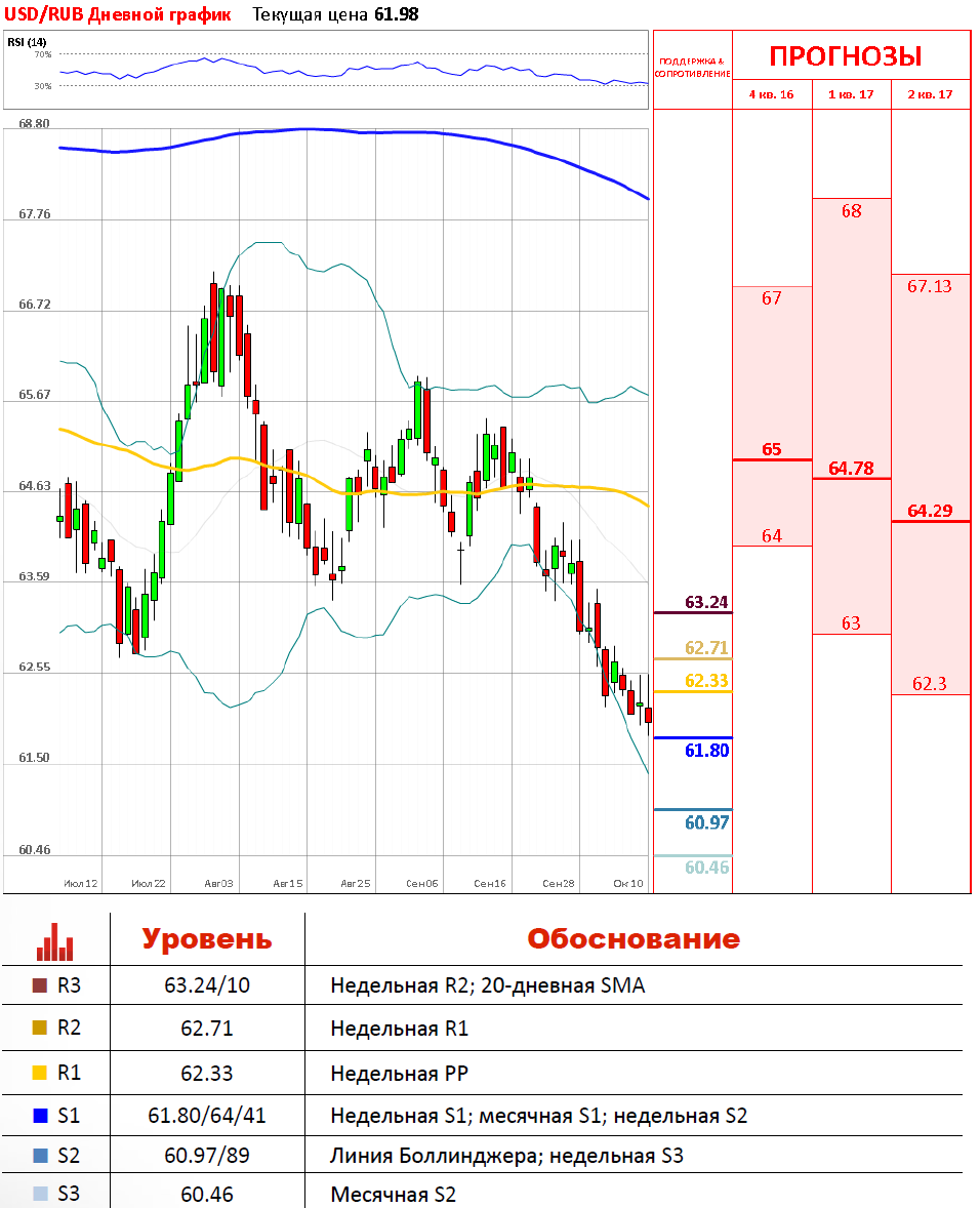 В понедельник российскую валюту поддержало заявление президента Владимира Путина, после которого цена на нефть выросла. Таким образом, вчера российская валюта подорожала к доллару США на 0.25% до 61.97 рубля. Тем не менее, одной из причин, почему сейчас рубль укрепляется несколько медленнее, чем раньше при росте цены на нефть является возможность выхода ЦБ на рынок. Сейчас валютная пара снизу сдерживается скоплением поддержек, а именно недельной и месячной S1, которые расположились на отметке 61.80/64.