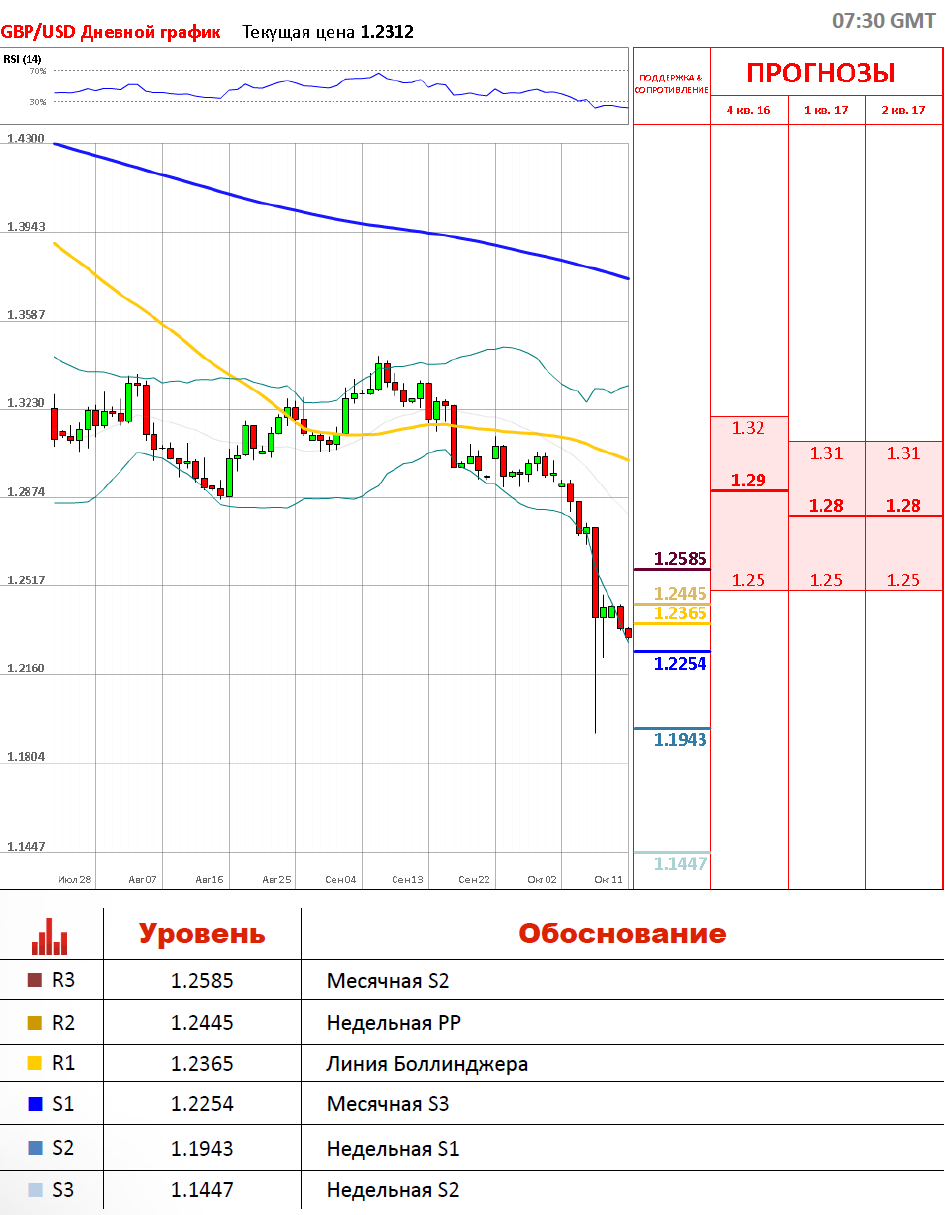 В первый день новой недели рынки в США были закрыты по случаю празднования дня Колумба. Тем не менее, это не спасло фунт от нисходящей коррекции, которая длится с начала октября. Паре не удалось консолидироваться, несмотря на небольшие попытки отскочить от уровня 1.2445. Как следствие, инструмент снизился ещё на 1% от этого уровня и на данный момент закрепился на отметке 1.23 будучи подкрепленным месячной S3 на уровне 1.225. Очевидно, что инструмент перепродан, а торги будут зависеть от технической картины. В случае продолжения снижения, пара сползёт к историческим минимумам в области 1.20.