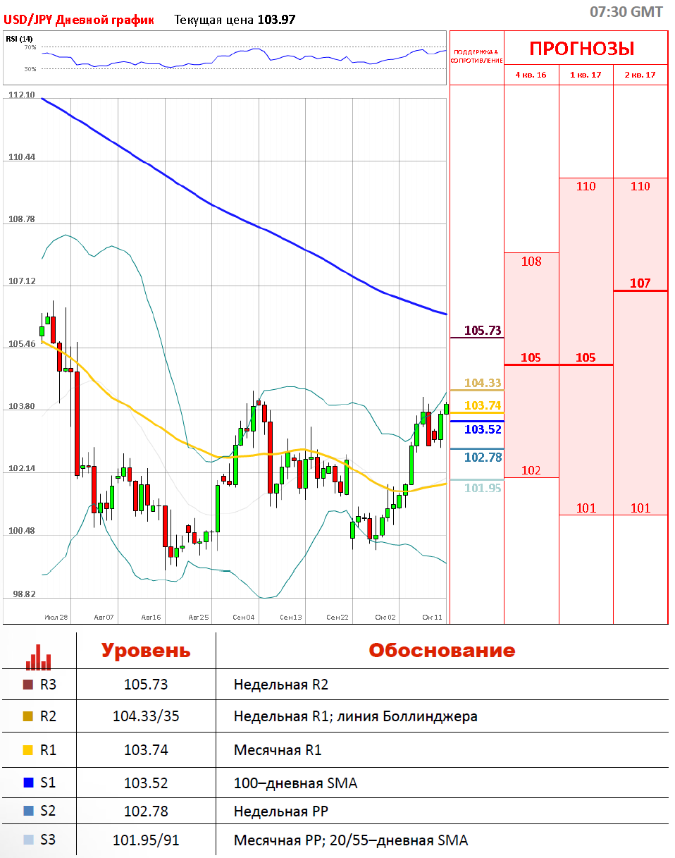 Доллар продолжает укрепляться по всему рынку, так как инвесторы надеются, что ФРС повысит ставку уже в этом году. Вчера пара торговалась с преобладанием бычьих позиций, в то время как нисходящий импульс продолжает угасать. Инструмент пробил месячную R1 на уровне 103.74 и устремился к взятию недельной R1 на отметке 104.35. Учитывая индикаторы, открытие длинных позиций по паре может быть рекомендовано, в то время как дальнейшее укрепление пары наиболее вероятно. Тем не менее, покупатели могут снова протестировать уровень 103.5, а затем поднять цену к отметке 104.