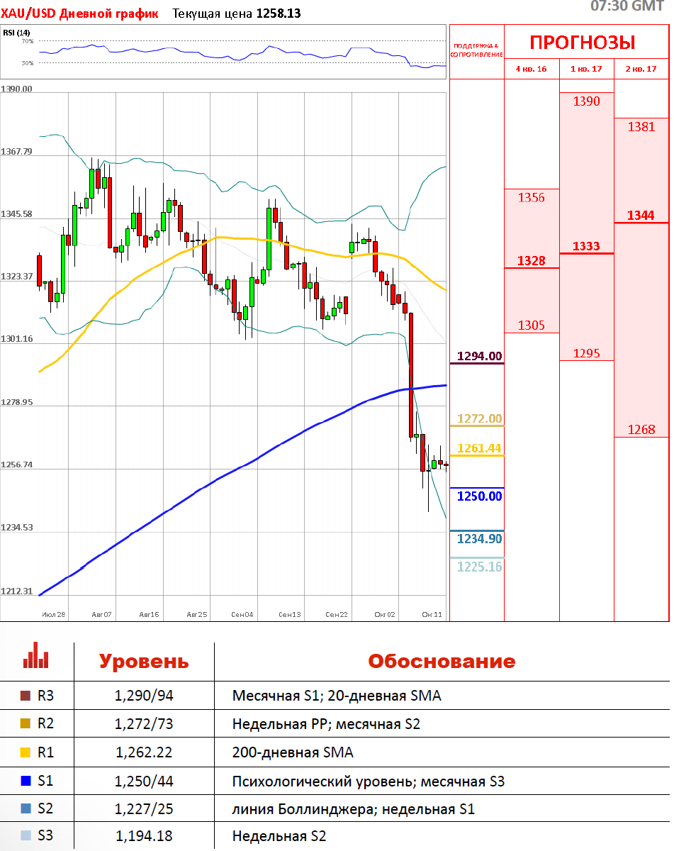 Укрепление американской валюты негативно влияет на золото, делая его дороже для держателей иностранных валют. Участники рынка продолжают делать ставки на то, что ФРС США повысит базовую процентную ставку с текущего уровня 0,25-0,5% годовых на своем декабрьском заседании, что окажет давление на драгметалл. Однако, сегодня золото торгуется с позитивной динамикой, где снизу поддерживается месячной S2 на 1,244.