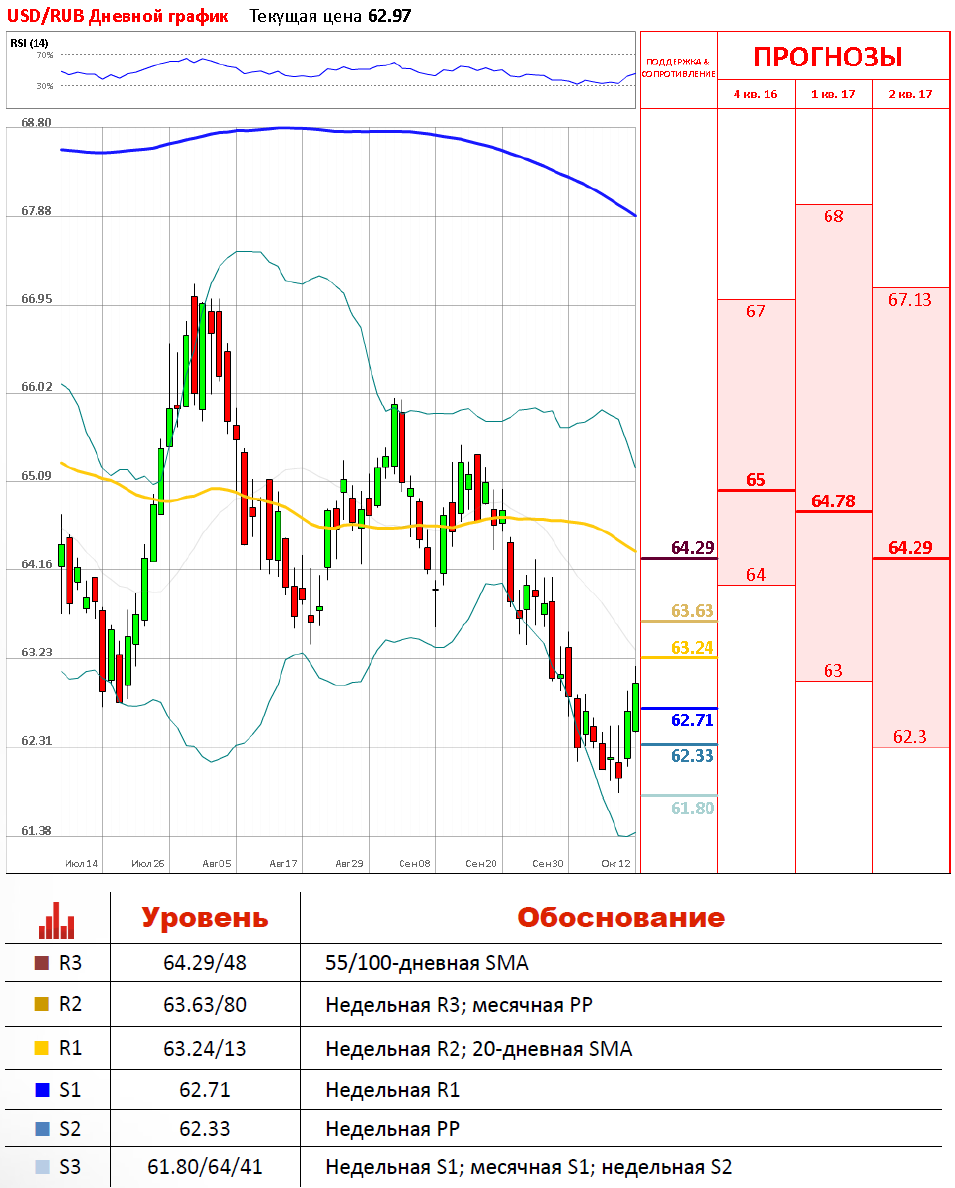 Курс рубля против доллара вчера вечером, во вторник, снижался, реагируя на слабую динамику рынка нефти, опустившегося ниже отметки 52 доллара за баррель сорта Brent. В то же время, словесные интервенции, были противоречивыми для рубля. Так, позитивом стало то, что ЦБ РФ не собирается отказываться от свободного плавания рубля, а Россию не ждет новая девальвация рубля, как в кризис 2014 года. Сегодня курс валютной пары продолжает свое восходящее движение, где сверху она сдерживается 20-дневной SMA и недельной R2 на 63.13/24.