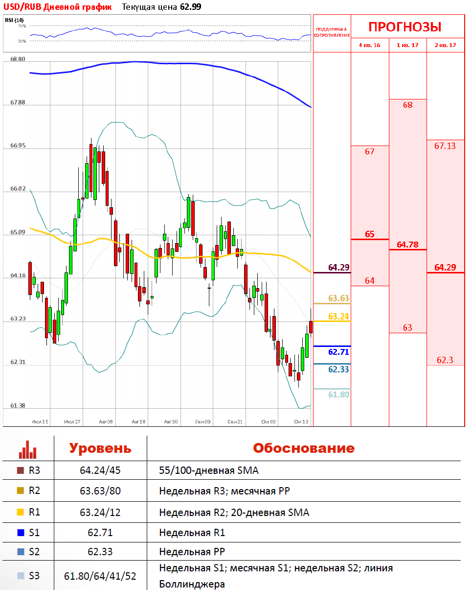 Курс рубля против доллара вчера, в четверг, демонстрировал преимущественно снижение в рамках коррекции на фоне неуверенной динамики рынка нефти. В итоге, на этом фоне рубль обновил двухнедельный минимум к доллару, который поднимался до 63.52 рубля, однако закрылись торги в пользу российского рубля около отметки 62.99. От дальнейшего падения вниз валютную пару сдерживает недельная R1, которая расположилась на отметке 62.71, а сверху пара сдерживается недельной R2, которая находится на 63.24.
