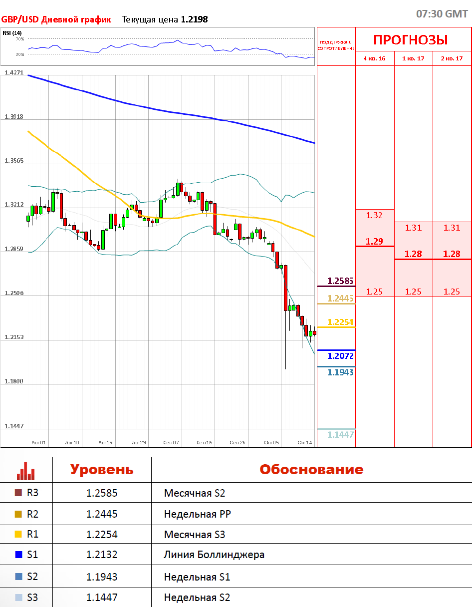 Американская валюта достигла максимумов 7-месяцев по отношению к основным валютам. Настолько сильная поддержка была оказана протоколами сентябрьского заседания Центробанка США, которые укрепили надежды на повышение процентной ставки. Вчера, пара продолжала торговаться под месячной PP на уровне 1.2254 демонстрируя медвежий тренд. Ожидается, что нисходящий тренд продолжит своё уверенное существование и имеет все шансы опуститься ещё ниже, достигнув уровня 1.215. В случае пробития данного уровня, инструмент сползёт в область 1.20.