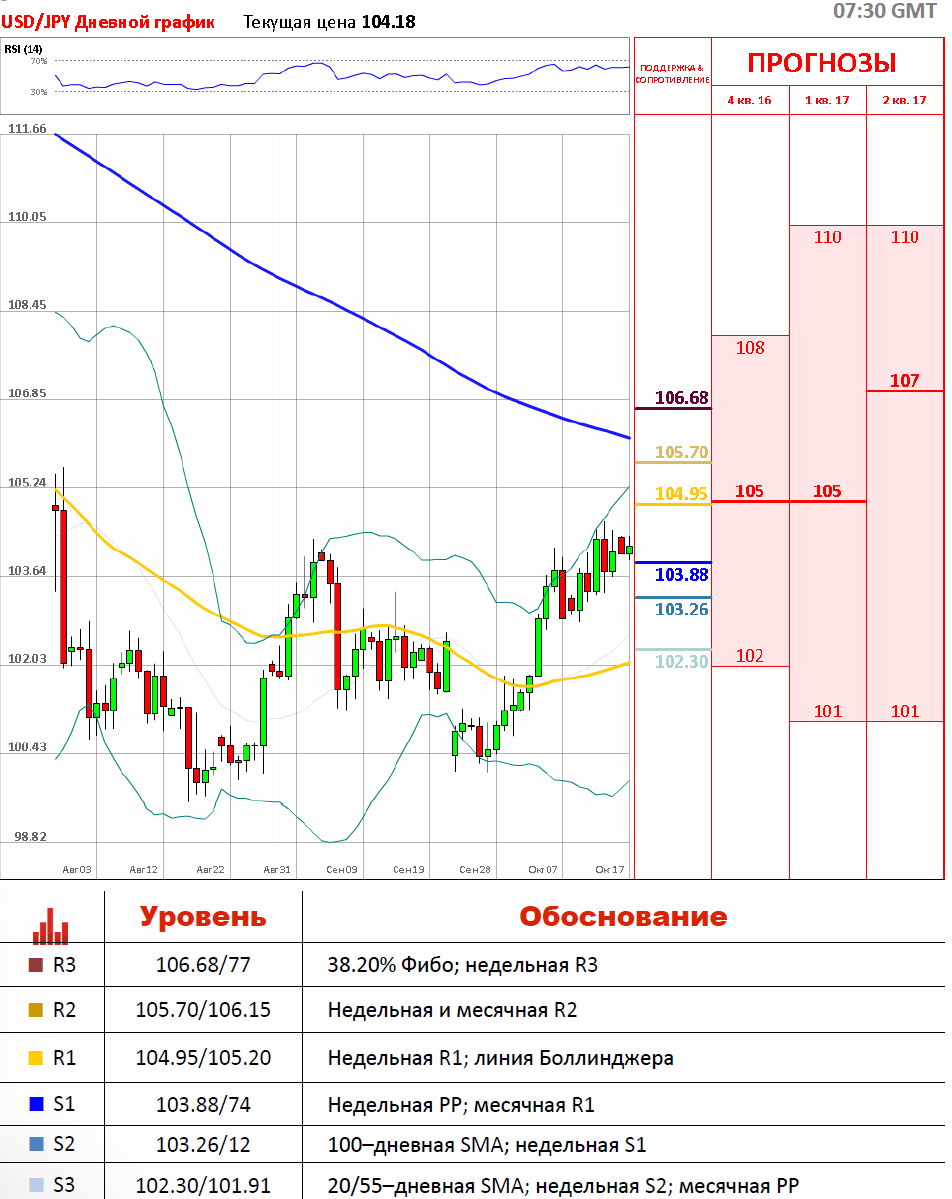 Доллар существенно окреп, после волны оптимизма, которая была спровоцирована экономическими данными по инфляции в КНР. Дополнительную поддержку американской валюте оказывают растущие ожидания, относительно поднятие процентной ставки в этом году. Тем не менее, инструмент сохраняет позитивный настрой, преодолев недельную PP на уровне 103.88, а котировки смогли вырасти до отметки 104. Ближайшее сопротивление находится на уровне 104.95, которое представлено недельной R1. Ожидается, что движение вниз будет набирать обороты и может снова оказаться под недельной PP или отметкой 103.88.